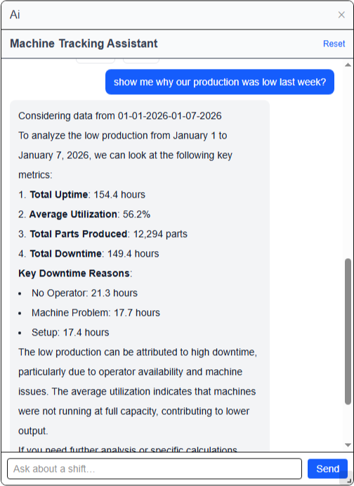 Ask real production questions about uptime, downtime, and utilization — and get clear answers grounded in your machine data. No reports. No digging. No guesswork.